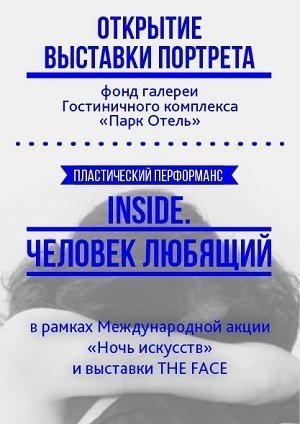 Отдел современного искусства Художественного музея представляет выставку живописного портрета из коллекции В. В. Воронского, которая дополнит и расширит тему портрета человека, освящённую на выставке The Face. Будут представлены работы художников как регионального, так и международного значения, различных стилей и направлений. Открытие пройдёт, как всегда, необычно: организаторы подготовили не только экскурсию по самой выставке, но и динамическую составляющую мероприятия — пластический перформанс «Inside. Человек любящий» от «ТеатраForm» — поиск-эксперимент о месте человека в мире и в самом себе под живую музыку. Режиссёр — А. Бударина, музыка — О. Очеповская, постановка танцев — Е. Шумская (балет «Театро»). Кроме того, гостей ожидает лёгкий фуршет. Начало — 19:00. Вход — 100 рублей. Рекомендуемый дресс-код — cocktail. 0+