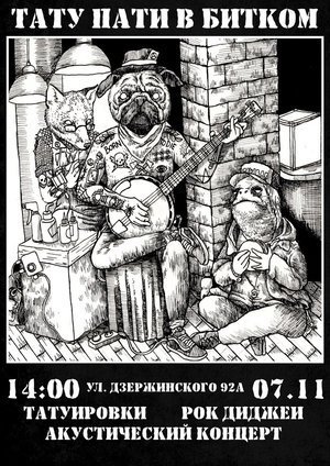 «Бит.com» в этот уикенд строит настоящую тату-вечеринку, на которой будут присутствовать мастера, готовые выполнить работу по готовым эскизам или вашей собственной картинке. Минимальная стоимость татуировки — 1 000 рублей (цена зависит от сложности процесса). А по ходу работы татуировщиков в клубе будут выступать диджеи и музыкальные исполнителей с акустическими программами. Начало — 14:00. Вход свободный. 18+